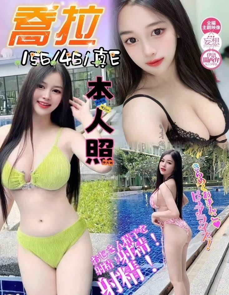喬拉 年齡: 24 罩杯: E 身高: 156 體重: 46KG 服務/類型: 殘廢澡 無套吹 舌吻 6 9 品鮑 口爆 舔蛋 無套內射 情趣角色扮演 買兩節送1S 買三節送一節 加價項目: 2S+0.5k 口爆+0.5K 無套內射+1K