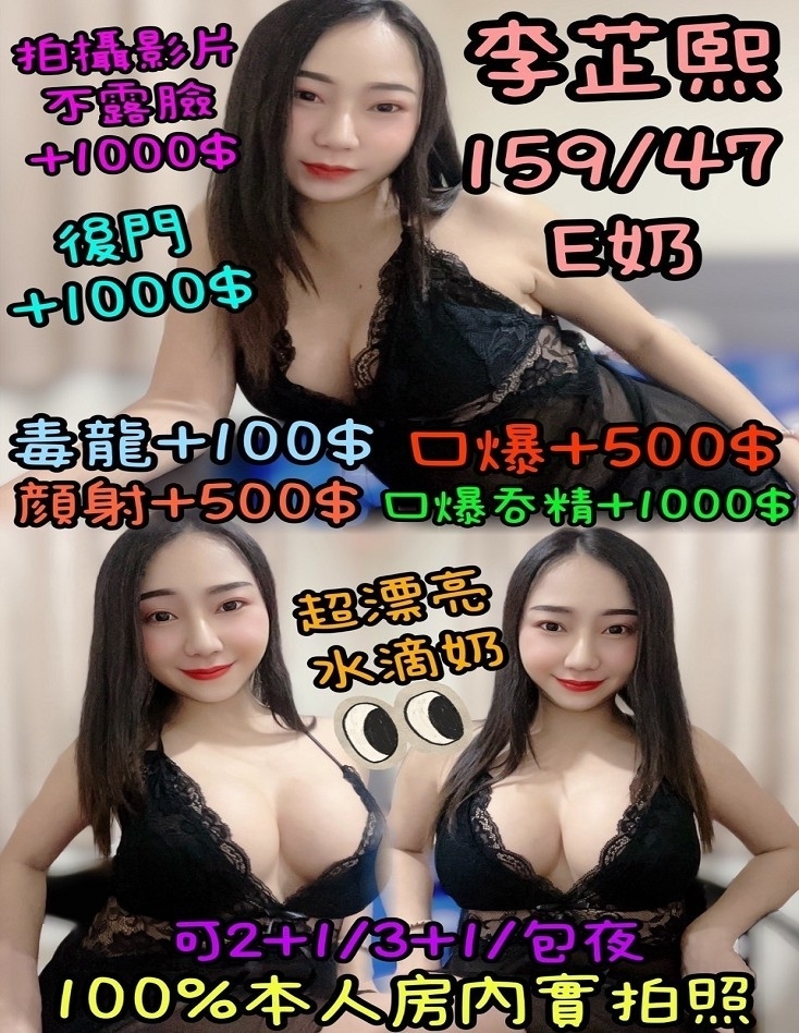 李芷熙 年齡: 24 罩杯: E 身高: 159 體重: 47KG 服務/類型:鴛鴦浴 無套吹 戴套做 6 9 品鮑 毒龍 口爆 吞精 按摩 奶砲 舔蛋 後門 顏射 配合穿絲襪 性愛攝影 非侵入性情趣用品 買兩節送1S 買三節送一節 買五節送三節 (包夜23:00開始) 加價項目: 毒龍+0.1K 顏射+0.5K 口爆+0.5K 後門+1K 吞精+1K 不露臉拍攝+2K